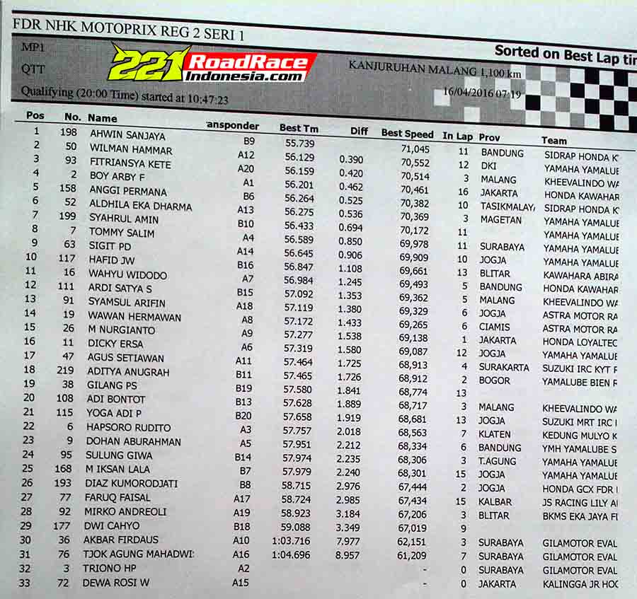 Jadi balapan mp1 akan seru, dengan hadirnya pembalap-pembalap papan atas tersebut. Apalagi pole position sampai urutan-9, perbedaan waktunya tidak sampai 1 detik, sangat rapat untuk memperebutkan posisi satu. Dan pada 10 pembalap di depan didominasi pembalap yamaha (mx king) serta beberapa pembalap honda (sonic150r), sedangnkan 2 pembalap suzuki (saifufi) berada di urutan 17 dan 21. Berikut ini hasil kualifikasinya :