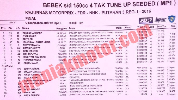 Dan persaingan ketat kembali terjadi saat race, dan akhirnya renggi lukmana (mx king) berhasil meninggalkan rival beratnya yaitu ivon nanda dan zefri adi (sonic150r) dengan selisih waktu yang lumayan jauh. Berikut hasil race di muara tebo, jambi kemarin