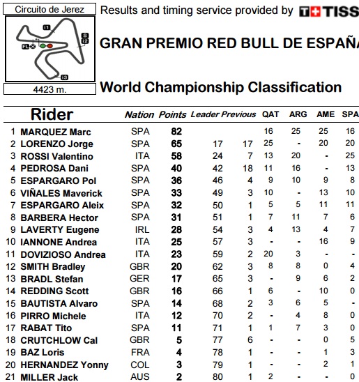 Terlihat marquez meskipun kalah, dan hanya mendapat posisi-3, tampak gembira. Mungkin menurutnya hasil itu sudah maksimal, dan lumayan tambah 16 poin. Barangkali kalau ia tidak bersabar dan memaksakan diri, malah crash dan tidak dapat point. Marquez juga gembira karena masih bisa memimpin klasemen pembalap sementara ini, dengan selisih yang signifikan. Berikut klasemen sementara sampai race motogp di jerez 2016.