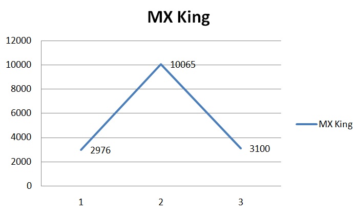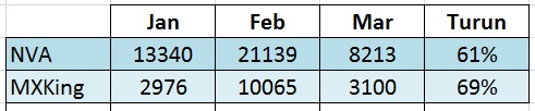 Jika distribusi nva turun 61 % di bulan maret, maka mx king lebih parah lagi turun 69%. Jika melihat kondisi bulan januari, sesungguhnya distribusi sebesar ini termasuk baik, karena naik dari 2976 menjadi 3100 unit. Jika distribusi bulan januari dan maret dikatakan normal, maka distribusi februari dapat dikatakan tidak normal, karena naik 238% dari januari kemudian turun 69% di maret.