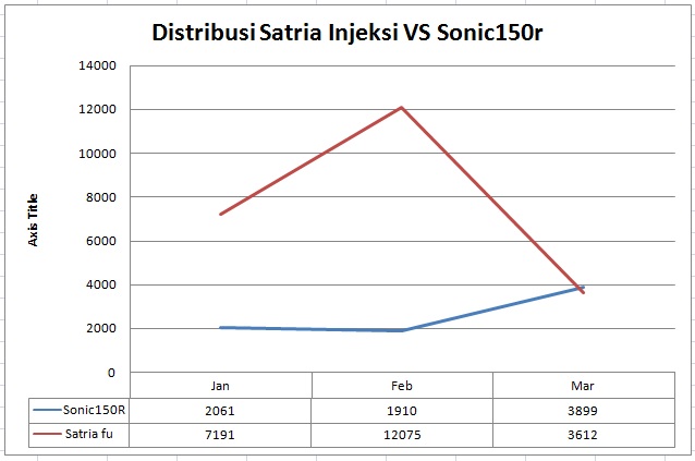 Berikut ini tabel dan grafik distribusi satria fu 150 fi dan saingan terdekatnya sonic150r, selama januari sampai maret 2016.