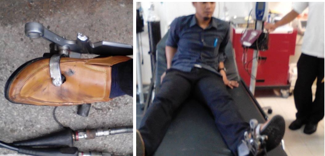 Pedal (step) operan gigi masuk menusuk telapak kaki dari atas. Sekaligus menjepitnya bersama footstep sehingga kaki+sepatu terkunci, tidak bisa dilepas. Jalan satu-satunya adalah melepas operan gigi tersebut, baru kemudian di bawa ke rumah sakit.