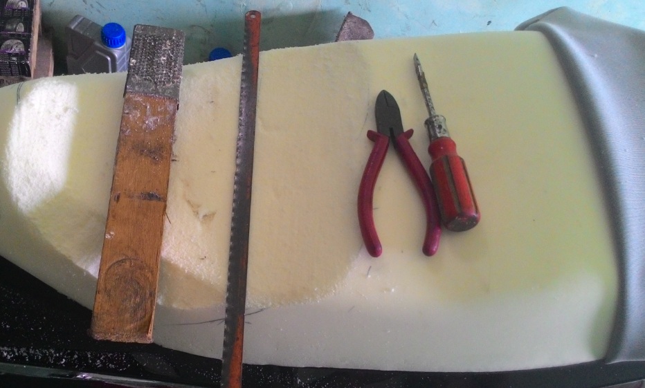 6. Serutan busa jok. Alat 3-4-5 digunakan untuk memodifikasi bentuk busa jog agar sesuai dengan keinginan.