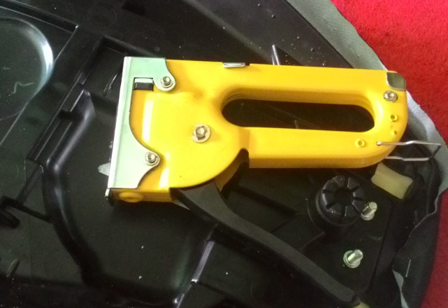 Buka 2 mur 10, untuk melepas jog dari engselnya. Kemudian gunakan obeng minus untuk mencongkel staples dan selanjutnya gunakan tang untuk mencabut staples tersebut.