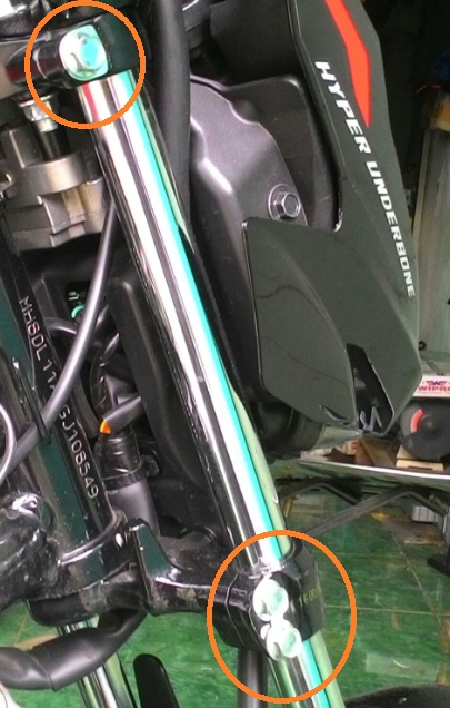 Kebentulan semua baut pengikat batang/tabung sok depan satria fu 150 fi terlihat semua (di luar). Sehingga untuk mengendorkannya sangat mudah, cukup sediakan kunci ring/sok ukuran 12. Ke-3 baut pengikat (1 atas, 2 bawah) cukup dikendorkan, tidak perlu sampai terlepas. Setelah batang sok sudah bisa bebas naik turun, tinggal disesuaikan dengan style yang diinginkan.