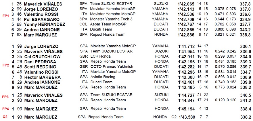 Marc Marquez (mm93) mengawali free practice dengan kondisi susah payah. Menghadapi surkuit yang berkarakter agak cepat, mm93 keteteran di posisi-7 (fp1) dan posisi 9 (fp-2). Akan tetapi setelah terjadi kecelakaan yang menimpa Luis Salom, sehingga panitia lomba merubah layout sirkuit, tiba-tiba mm93 mendominasi babak fp selanjutnya, bahkan menjadi pole position di q2.