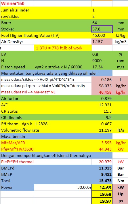 Apalagi kalau pakai setingan balap, misalnya cr=12:1, ve 90% dan power maksimum diletakkan di 11000 rpm, maka powernya bisa tembus 29.59 ps. Maklum bro 186 cc (bukan 150 cc lagi), menggunakan spek balap lagi, jadi wajar kalau powernya mendekati motor 250cc standar, yaitu 30 ps.