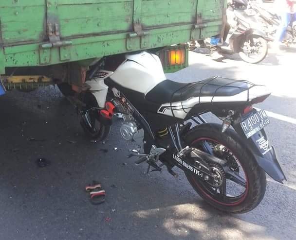Kaejadiannya yang ane alami, semata-mata karena kesalahan ane sendiri. Truk dengan bak besi plat logam (warna kuning) berjalan di depan kecepatan standar. Ane dengan mengendarai honda grand93 tepat di belakangnya sekitar 2 meter, juga jalan perlahan (standar). Tiba-tiba truk ngerem mendadak (mungkin menghiindari orang menyeberang jalan), cieeettt.., langsung berenti. Tapi ane di belakang dengan bobot lumayan (nggonceng temen) kaget, hanya sempet ngerem sedikit (atau mungkin tidak ngerem sama-sekali), langsung , brakkk. Motor bagian depan masuk kolong bak truk bagian belakang. Untungnya kaca spion masih lengkap, sehingga 2 besi kaca spion berhasil menahan motor untuk tidak masuk sepenuhnya ke kolong truk.