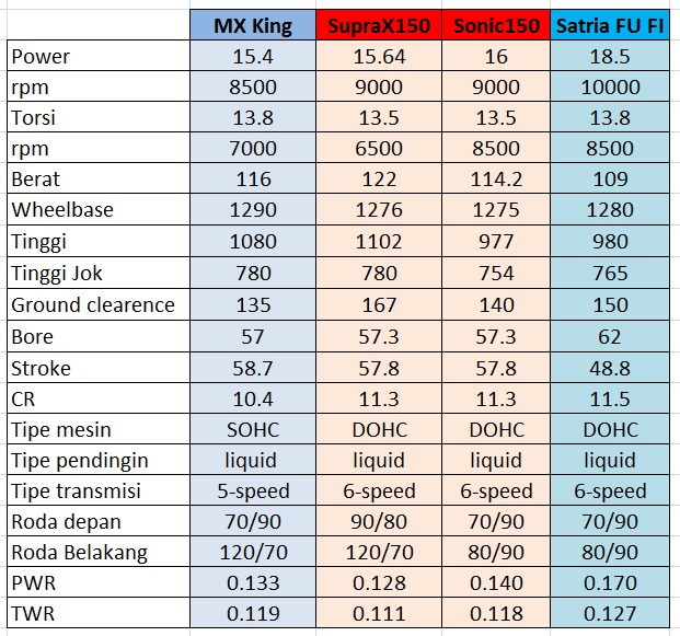 Menjelang lebaran ini, kemungkinan besar banyak rider yang ingin naik kelas dari bebek 125 cc ke super underbone 150cc. Kadangkala agak bingung juga dengan 4 pilihan yang ada di pasaran, mx king, supra gtr150, sonic150r atau satria fu 150 fi. Bagi yang ingin komparasi spesifikasinya, berikut ini tabelnya…