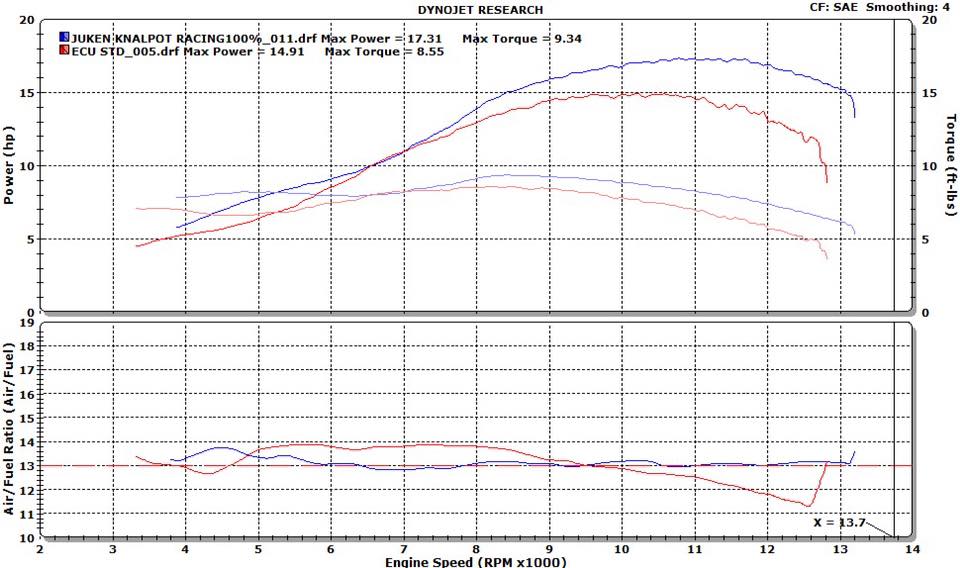 Kalau dilihat dari grafik powernya, mantab sekali. Power naik 2.4 hp sedangkan torsi naik 0.79 Nm, dan kenaikan power sudah bisa dirasakan sejak putaran bawah. Dan lagi power band-nya menjadi semakin lebar, terlihat ketika putaran mesin sudah mencapai 13000 rpm, power masih berada di 15 hp, padahal pada ecu std sejak 12700 rpm power sudah drop. [Mohon difahami bahwa hasil ini adalah versi on wheel dynojet, jadi kalau versi on crank dari pabrik sekitar 18.23 hp + 2.4 hp = 20.63 hp]