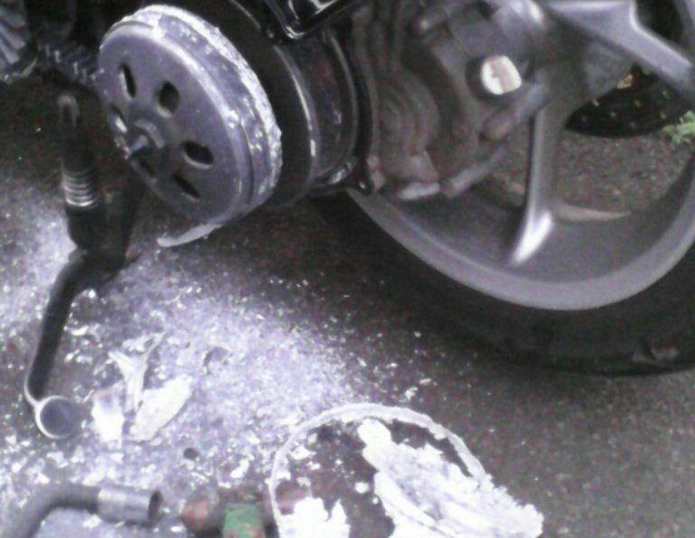 Gambar di atas adalah gambar cvt motor matic yang dibongkar. Di mana sebelumnya ban belakang terkunci tidak dapat berputar. Dan ternyata setelah cover cvt dilepas dengan sedikit pemaksaan, ada bagaian dari cvt yang meleleh, kemudian mengganjal bagian kopling otomatis dan cover cvt. [Masih kurang jelas bagian mana yang lumer, sepertinya bahannya terbuat dari logam alumunium (warna putih)]