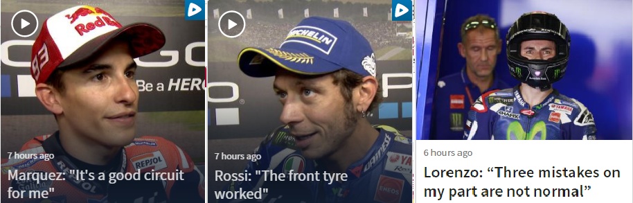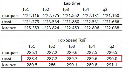 Valentino rossi meskipun hasil latihan bebas sampai kualifikasi selalu berada di bawah marquez. Ia mampu mencatatkan lap time yang terus membaik dan memiliki performa motor yang lebih kencang. Perhatikan catatan hasil latihan bebas sampai kualifikasi dari 3 kandidat juara.