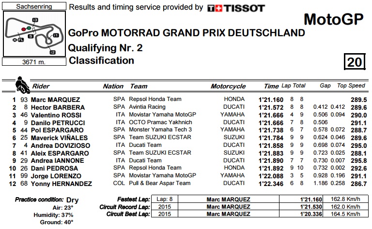 Kualifikasi telah selesai, dengan menenpatkan marc marquez sebagai pole position, hector barbera ke-2 dan valentino rossi ke-3. Sementara jandidat juara selain marquez dan rossi, yaitu lorenzo terpuruk di urutan ke-11. Jika melihat urutan ini, terlihat bahwa marquez memiliki kans paling besar untuk menang di race sanhsenring, jerman.