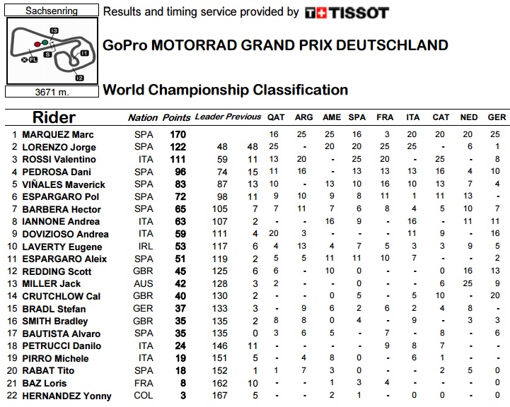 Posisi sementara marquez sangat jauh meninggalkan rival-rivalnya (lorenzo dan rossi). Konsrtruktor masih dipegang yamaha, sementara tim sudah ditangan repsol honda.