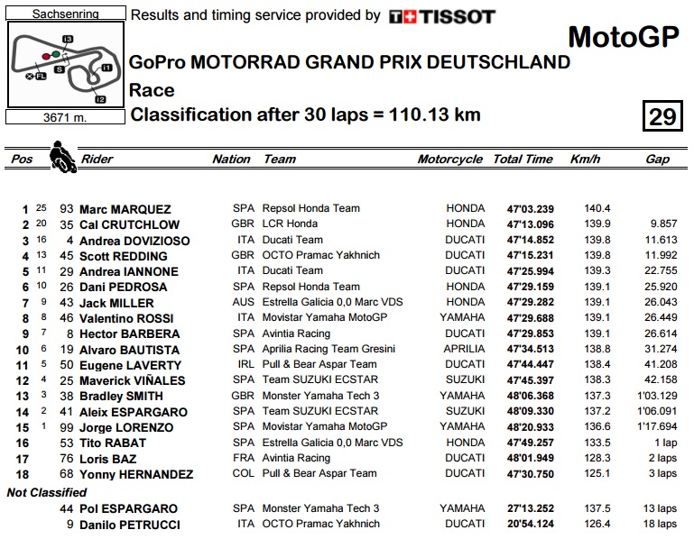 Race sachsenring dalam kondisi basah (wet) sudah berahir dengan cukup dramatis. Semua prediksi menjadi berantakan dengan adanya lintasan sirkuit yang basah, karena pembalap papan tengah lebih berani dibandingkan pembalap papan atas. Apalagi ditambah dengan sistem flag to flag menjadikan strategi penggantian motor menjadi bagian penting dari kemenangan.