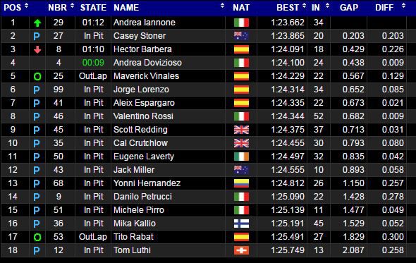 Dan barusan, dihari ke-2, stoner mencatatkan dirinya sebagai pembalap tercepat nomor dua, di bawah iannone. Hebatnya, raihan waktu tersebut diperoleh stoner tanpa pengaplikasian winglet di motornya. Dan barangkali jika motor tersebut digunakan oleh rider ducati lainnya, maka akan lebih lemot dari stoner. Berikut raihan waktunya…