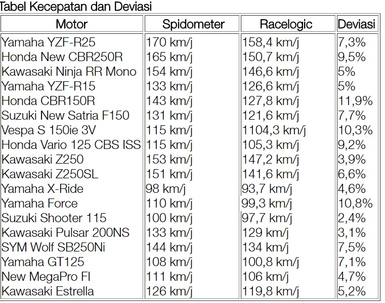 Dari tabel tersebut di atas top speed pada gigi-6 di 11000 rpm adalah 144.64 kpj. Atau terjadi penyimpangan sebesar 6%. Jika dibandingkan dengan hasil pengetesan kru otomotif, dalam suatu artikelnya, top speed saifufi di atas motor 150 cc lainnya. Bahkan lebih kencang dibandingkan kawasaki z250sl dan pulsar 200ns.