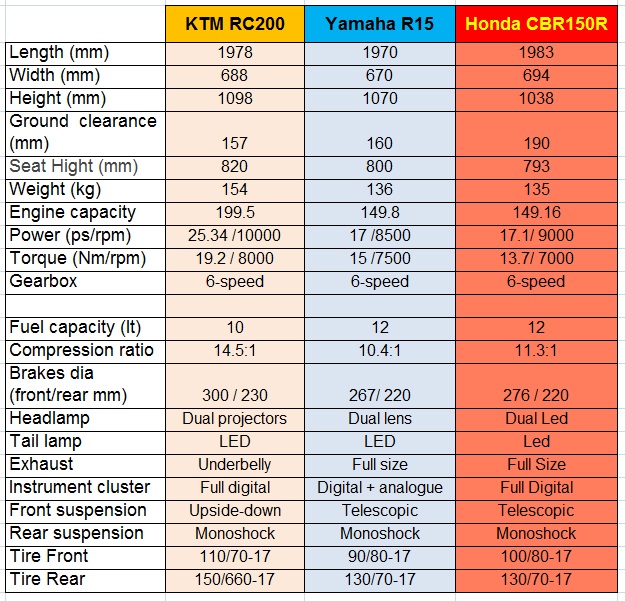 RC200 vs CBR150R vs R15 specification by motogokil