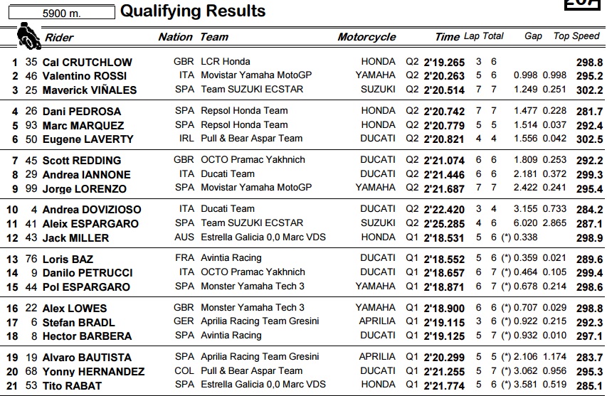 Tentunya keberhasilan ini sungguh luar biasa, karena cal berhasil mengalahkan para kandidat juara sekaligus para petarung di grup terdepan, seperti iannone dan dovizioso. Sementara kandidat kuat juara dunia, yaitu marc marquez bernasib naas. Dua menit sebelum berahirnya babak kualifikasi, ia mengalami crash cukup hebat, sehingga tidak mampu malanjutkan babak kualifikasi. Akhirnya ia harus puas berada di posisi-5 saat start nanti.