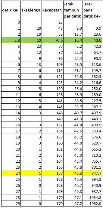 Jika kita mencoba mencatat semua kecepatan mulai dari awal, maka terlihat bahwa kecepatan 167 kpj di r25 dicapai pada detik ke 24. Dengan mencatat perubahan kecepatan (versi speedoemeter) setiap detik, maka bisa diperhitungkan berapa jarak yang telah ditempuh dalam setiap kenaikan 1 detik. Silahkan simak hasil perhitungan motogokil dalam tabel ini (tabel ini merupakan rangkuman perhitungan dengan ketelitian 0.1 detik)