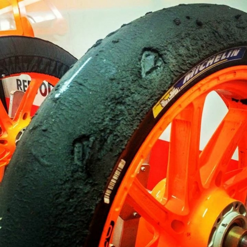 Salah satu penyebab anjlognya performa dp26 adalah performa ban michelin yang ia gunakan. Mungkin ada yang menganggap dp26 mencari kambing hitam atas kesalahannya memilih ban, karena rider yang lain tidak mengalami masalah. Akan tetapi jika melihat hasil upload gambar ban depan rc13v-nya, barulah kita faham bahwa memang pernyataan dp26 ada benarnya.