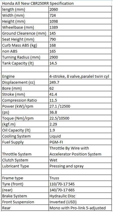 Berikut ini spesifikasi all new cbr250rr secara lengkap…