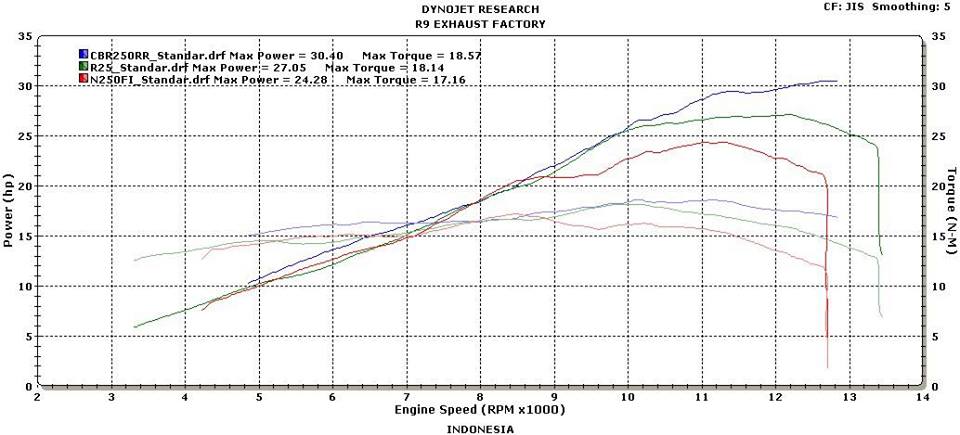 Jika melihat grafik diatas, sepertinya cbr250rr di atas angin. Tapi anehnya kok cuma sampai 13000rpm?Jangan2 kalau dilanjut sampai 14000rpm, semakin besar selisihnya dengan rival2nya.