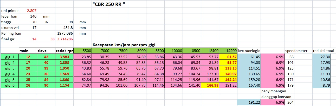 Dari perbandingan topspeed pada gigi-6 dan catatan racelogic tedapat selisih hampir 7%, race logic menunjukkan 167.4 km/jam. Maka dapat dibentuk perhitungan tabel kecepatan cbr250rr standar, dengan rasio transmisi prediksi disesuaikan dengan gigi, rpm dan kecepatan versi racelogic. Mari kita lihat tabelnya