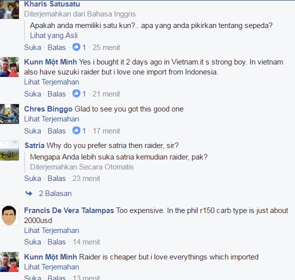 Heran juga motogokil, tuh satria fufi di vietnam bisa jauh banget harganya dengan di Indonesia, apakah spesifikasinya berbeda, material/part berbeda, atau karena hal lain seputar biaya kirim, paja dan lain-lain ? Bedanya sampai 142 %, banyak bro. Berikut ini percakapan si owner dari vietnam dengan satria lover di Indonesia