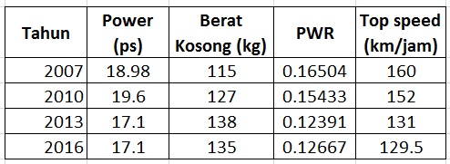 Untuk generasi karbu, di kalim powernya 18.98 ps dengan bobot kosong 115 kg. Bobot isi kalau diisi berbagai cairan sampai bisa jalan mungkin sekitar 124 kg, sehingga pwr-nya sebesar 0.153 ps/kg. Lumayan besar, untuk mencapai topspeed, dan diklaim topspeed nya bisa mencapai 160 kpj. Kemudian dengan engine yang sama, model dan performa berubah, lihat tabel berikut