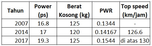 Untuk generasi karbu, di kalim powernya 18.98 ps dengan bobot kosong 115 kg. Bobot isi kalau diisi berbagai cairan sampai bisa jalan mungkin sekitar 124 kg, sehingga pwr-nya sebesar 0.153 ps/kg. Lumayan besar, untuk mencapai topspeed, dan diklaim topspeed nya bisa mencapai 160 kpj. Kemudian dengan engine yang sama, model dan performa berubah, lihat tabel berikut
