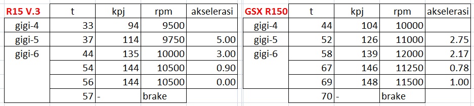Kedua motor ini (gsx r150 dan r15 v3) telah di test oleh test rider otomotif (sama ridernya), dan sirkuit yang sama (sentul). Videonya pun sudah ada di youtu*e, jadi semuanya bisa diliihat dan dianalisis secara bebas. Motogokil coba berangkum beberapa kejadian yang penting untuk menyimpulkan secara kasar akselerasi masing-masing motor.