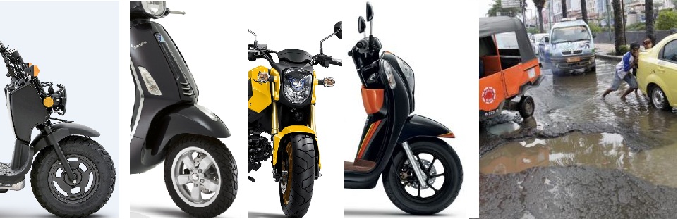 Lain halnya dengan negara kita tercinta, jalan-jalan banyak yang rusak, apalagi setelah hujan deras dan banjir. Jangankan jalan di pinggir kota atau pedesaan, jalam dalam kota besar pun banyak yang rusak dan berlubang. Kalaupun di tambal, yang sering terjadi tambalan tidak rata, sehingga jalan menjadi bergelombang. Penggunaan kendaraan beroda kecil tentunya akan memberikan efek guncangan yang lebih besar ketimbang roda yang lebih besar. Jangankan roda dengan diameter 12 inchi, yang 14 inchi saja masih merasakan guncangan yang cukup keras ketika (terpaksa) harus menerabas lubang-lubang tersebut. Barangkali untuk jalan seperti ini cocoknya menggunakan motor tril/adventure.