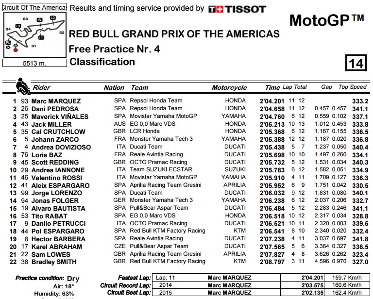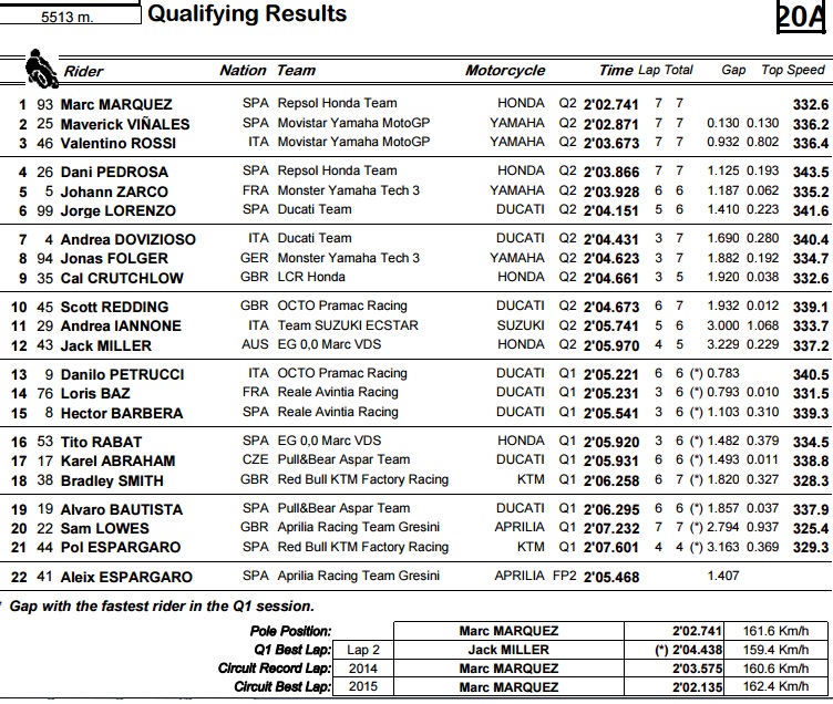 Posisi terdepan bergantian antara dua pembalap ini, vinales di fp1, marquez fp2, vinales fp3, marquez fp4 dan akhirnya marquez yang menjadi pole position di babak kualifikasi. Meskipun masih belum mampu menumbangkan best lap yang pernah ia ciptakan, akan tetapi marquez telah berhasil “memaksa” rc213v nya sampai batas maksimum. Sehingga ia mampu memecahkan record lap sirkuit yang ia ciptakan sendiri.