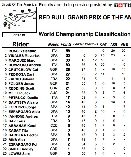Karena vinales gagal mendapat poin, akhirnya rossi lah yang menduduki puncak klasemen untuk sementara. Sedangkan vinales turun ke urutan-2 dan marquez naik ke urutan-3. Berikrut klasemen sementara para pembalap