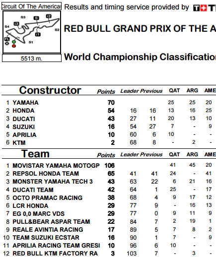 Dan posisi puncak klasemen tim dan konstruktor masih duduki oleh yamaha