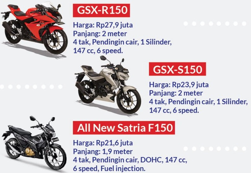 Kebetulan motogokil pernah merasakan ketiganyaa, spesial satria fu 150 fi dan juga gsx s150, dan in sya Allah akan datang gsx r150. Motor-motor ini memang mantab mas bro untuk ukuran di kelasnya. Membawanya dapat menjadikan adrenalin mengalir dengan deras. Naik motor ini harus fokus dan ekstra waspada, jangan sampai terlalaikan dengan buaian high speed yang dihasilkna oleh engine motor-motor ini.