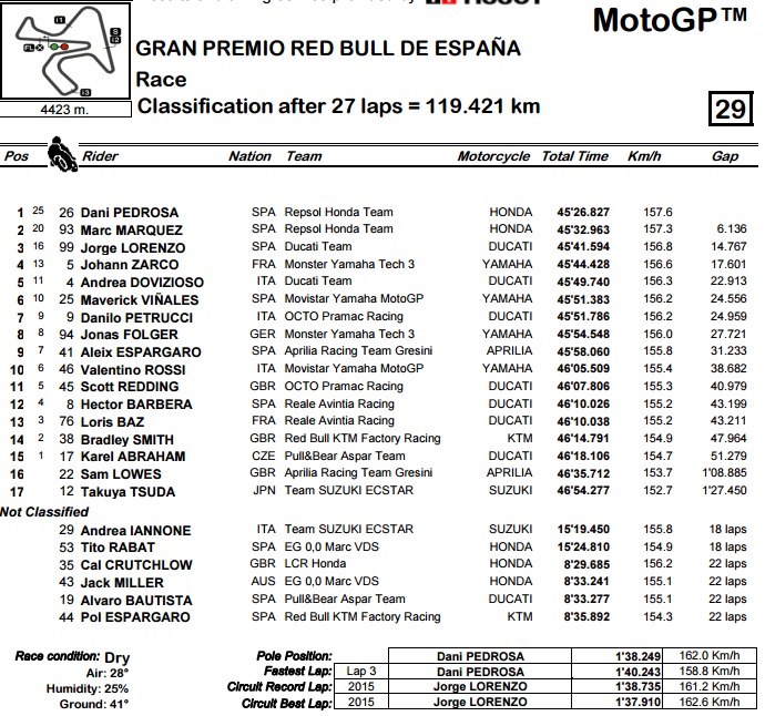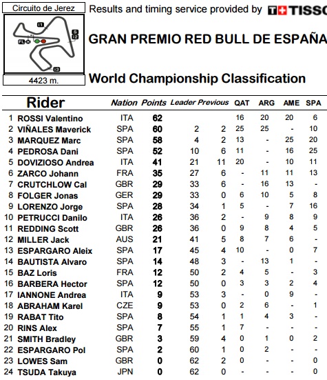 Klasemen pembalap untuk sementara masih dipuncaki valentino rossi dari tim pbrikan yamaha. Kemudian disusul oleh vinales, marquez dan pedrosa.