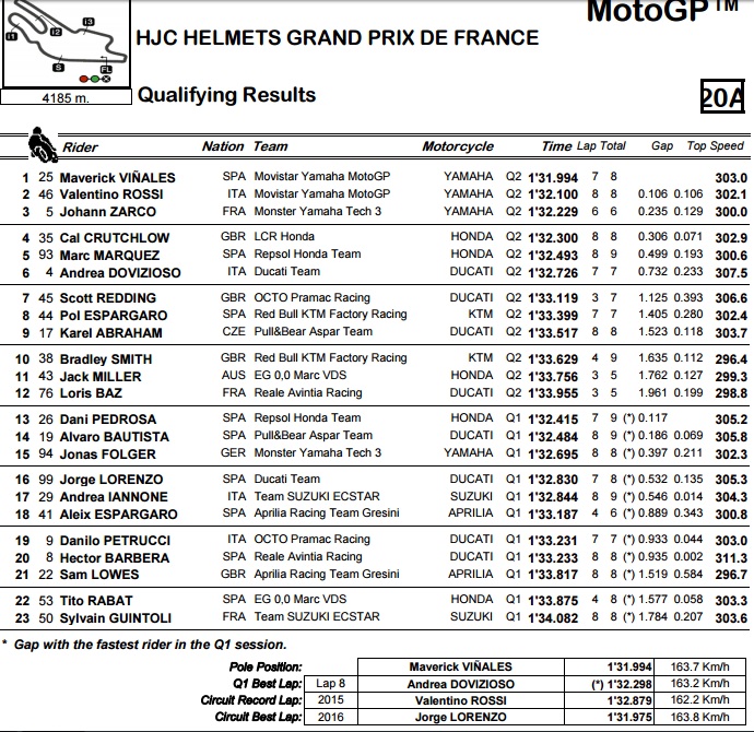 Yang lebih parah adalah dani pedrosa (dp26) terpaksa harus melewati q1. Tapi aneh juga, raihan waktunya masih lebih bagus dibandingkan marc marquez (mm93). Barangkali inilah kejutan-kejutan yang diberikan oelh sirkuit le mans prancis kali ini. Dan jika ternyata besok saat race, turun hujan, semoga kejutan-kejutan yang lain akan muncul.