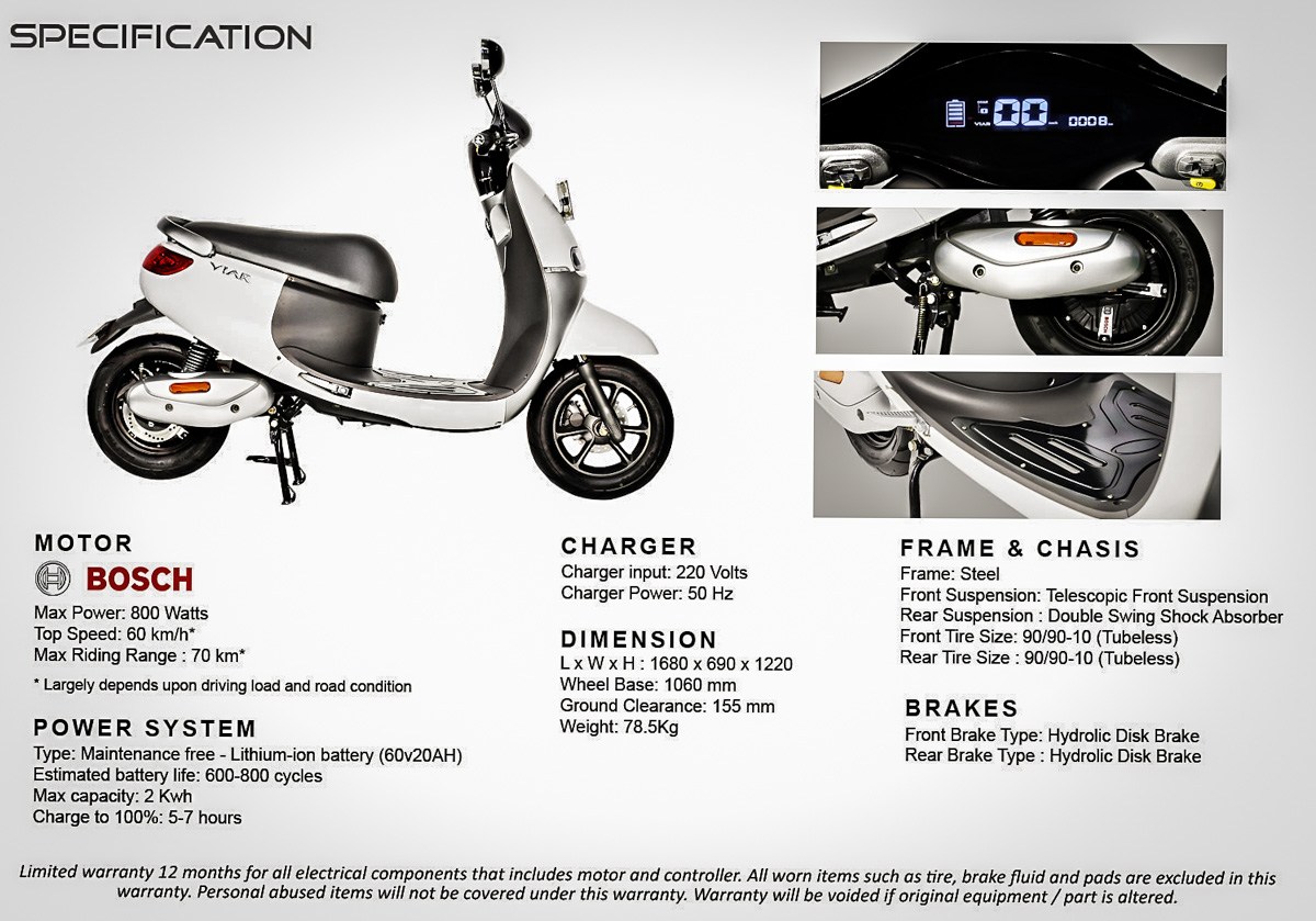 Rupaya fenomena mulai diliriknya motor listrik tidak luput dari perhatian pabrikan motor di Indonesia. Tahun ini viar merilis skuter listrik Q1, dengan spesifikasi yang cukup mantab digunakan untuk perkotaan / jarak dekat. Yang membuat viar q1 cukup “wow” adalah spesifikasi motor listrik yang digunakan adalah produk bosch. Siapa yang tidak kenal alat-alat listrik yang menggunakan motor listrik bosch, jaminan mutu. Berikut spesifikasi singkatnya